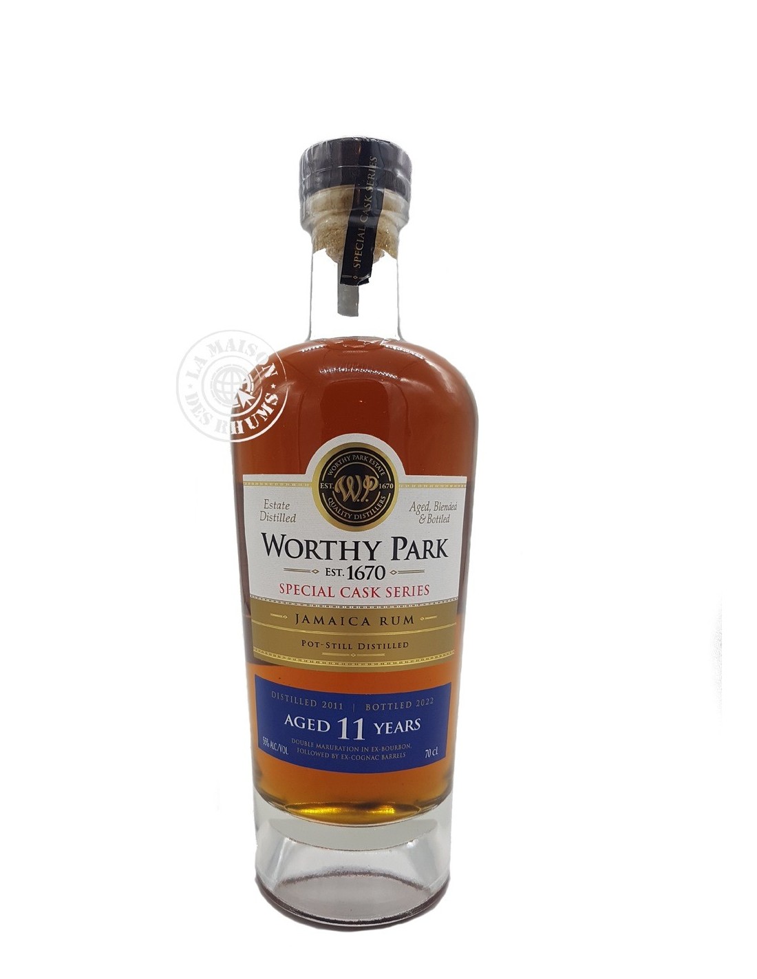 Ce Rhum Worthy Park Vieux Cognac Cask Finish 2011 55% de mélasse a bénéficié d’une distillation en alambic Double Retort Pot Still ainsi que d'un vieillissement de 8 années en ex-fûts de Bourbon. Il a ensuite été affiné en ex-fûts de Cognac durant 3 ans.