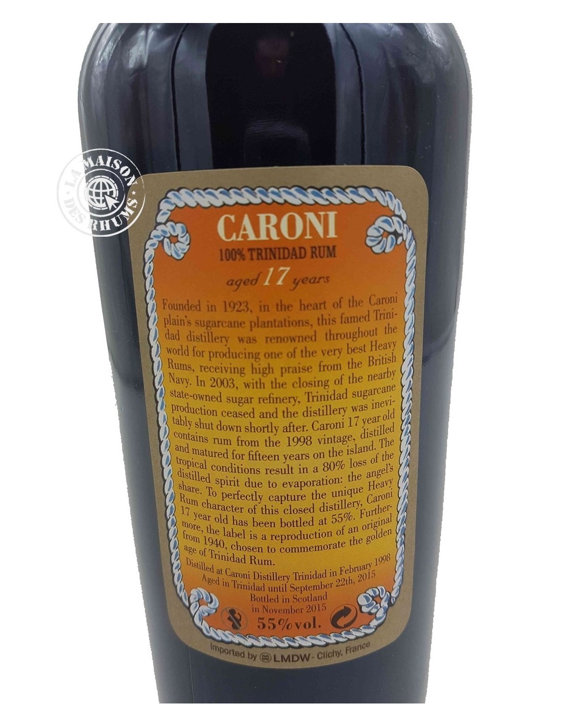 Ce Rhum Caroni Vieux 1998 17 ans 55% est issu du millésime 1998 et a intégralement vieilli en climat tropical à Trinité-et-Tobago avec une part des anges supérieure à 80% en 17 ans. L'étiquette est une reproduction de celles qui étaient présentent sur les bouteilles de Rhum Caroni dans les années 1940.