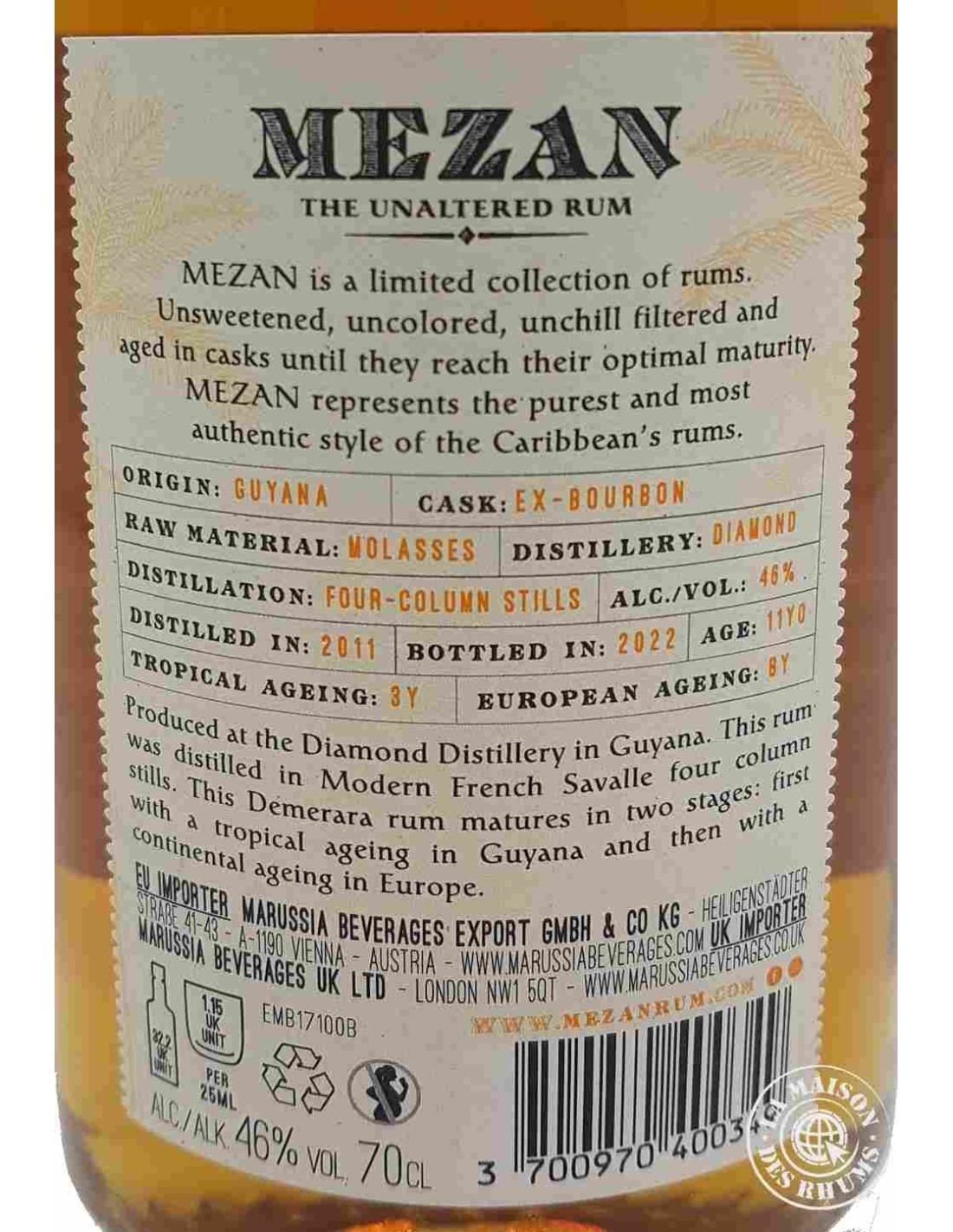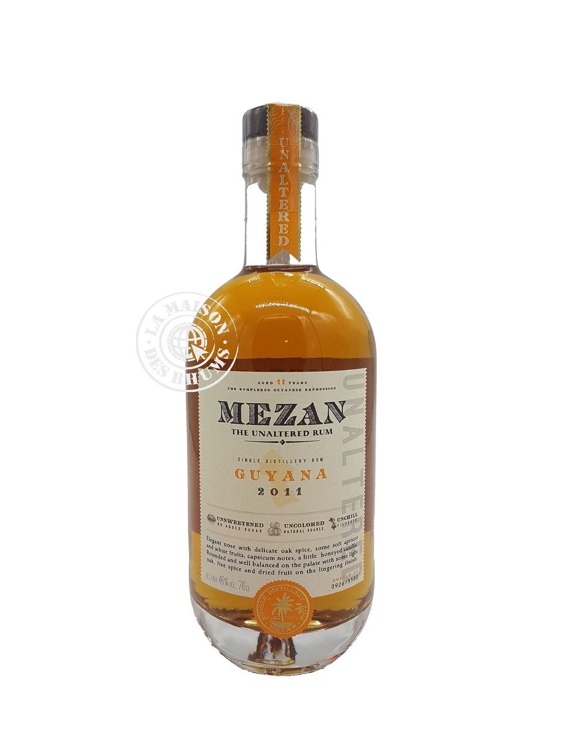 Le Rhum Mezan Vieux Guyana Millésime 2011 11 ans 46% est un Rhum Vieux produit par la dernière distillerie du Guyana, Demerara Distillers Limited. Produit à partir de mélasse et distillé en multi-colonne Savalle, ce Rhum a d'abord vieilli en ex-fût de Bourbon dans le pays avant de parachever sa maturation par 8 ans de vieillissement continental au Royaume-Uni.