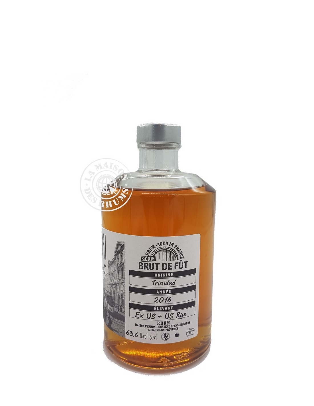 Le Rhum Ferroni Vieux Trinidad 2016 Brut de fût 63.6% a été sélectionné et élevé par le célèbre embouteilleur indépendant français, Maison Ferroni. Distillé en 2016, ce Rhum a d'abord vieilli en ex-fût de Bourbon avant d'être transféré en ex-fût de Rye Whiskey.