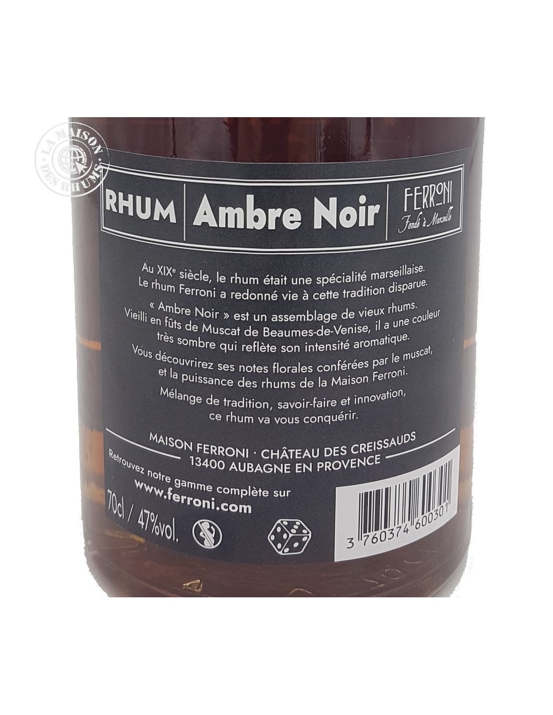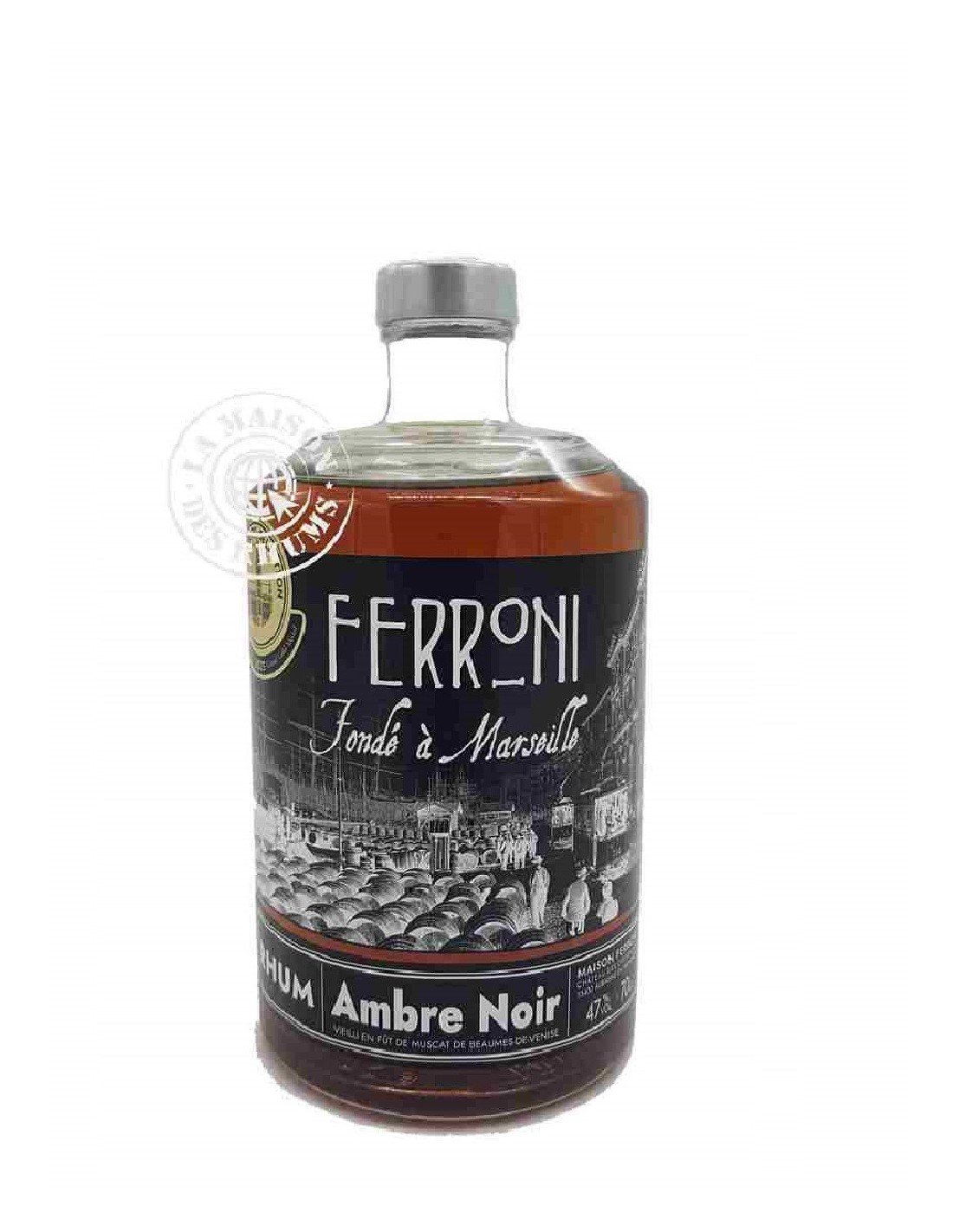 Le Rhum Ferroni Ambre Noir 47% est un assemblage de Rhums Vieux élevés en ex-fûts de Muscat de Beaumes-de-Venise. Ce vieillissement atypique couplé à son degré relativement élevé, confèrent à ce Rhum une robe très sombre et une palette aromatique intense oscillant entre notes florales et notes fruitées soutenues par de belles épices.