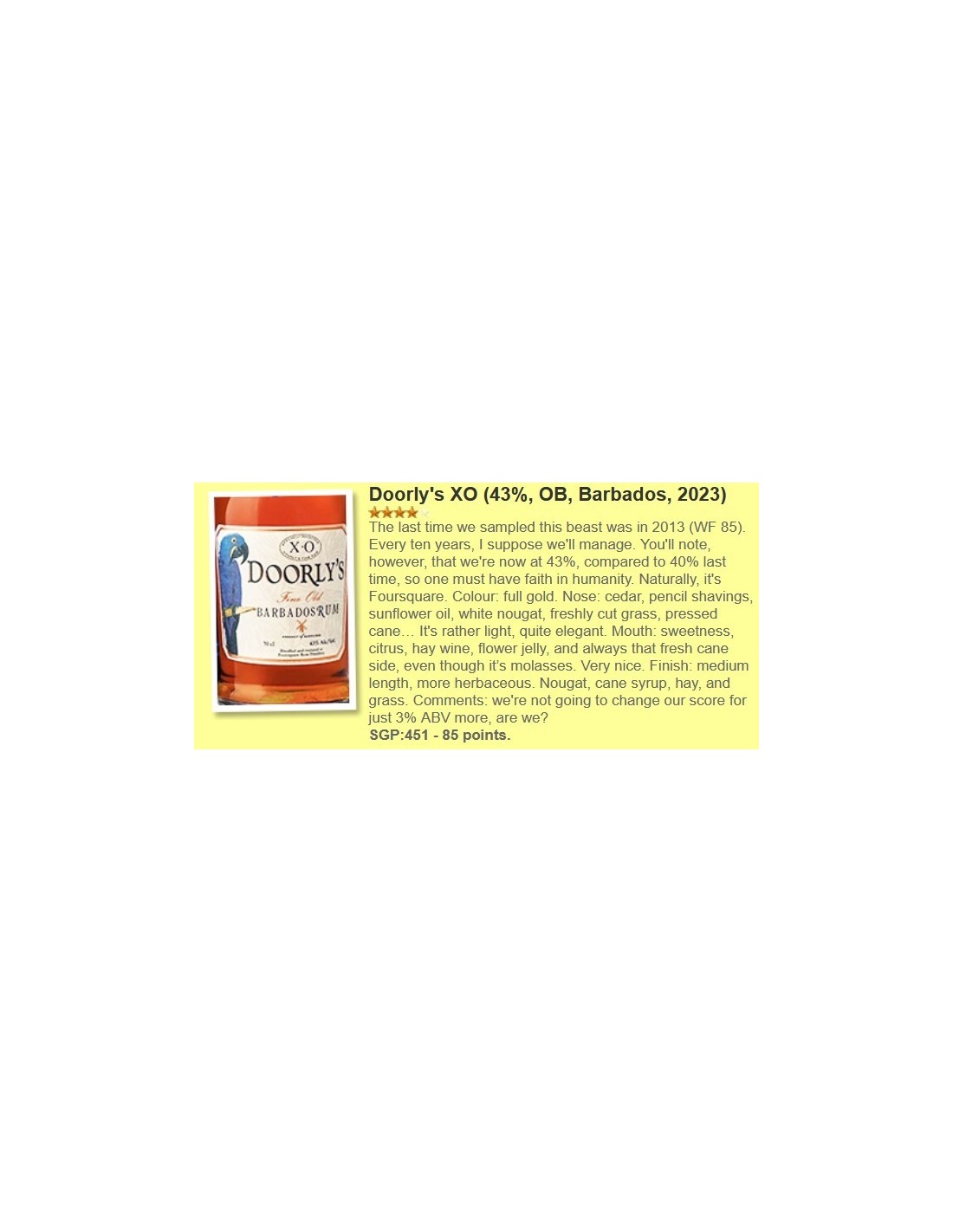 Le Rhum Doorly's Vieux XO Golden Rum 43% est un Rhum Vieux élaboré à partir de mélasses fermentées. Il s'agit d'un assemblage de distillats en alambic à repasse et en alambic à colonne vieillis en ex-fûts de Bourbon pendant 5 à 8 ans. Après assemblage, les Rhums finissent leur vieillissement en ex-fûts de Xérès Oloroso pendant 2 ans supplémentaires.