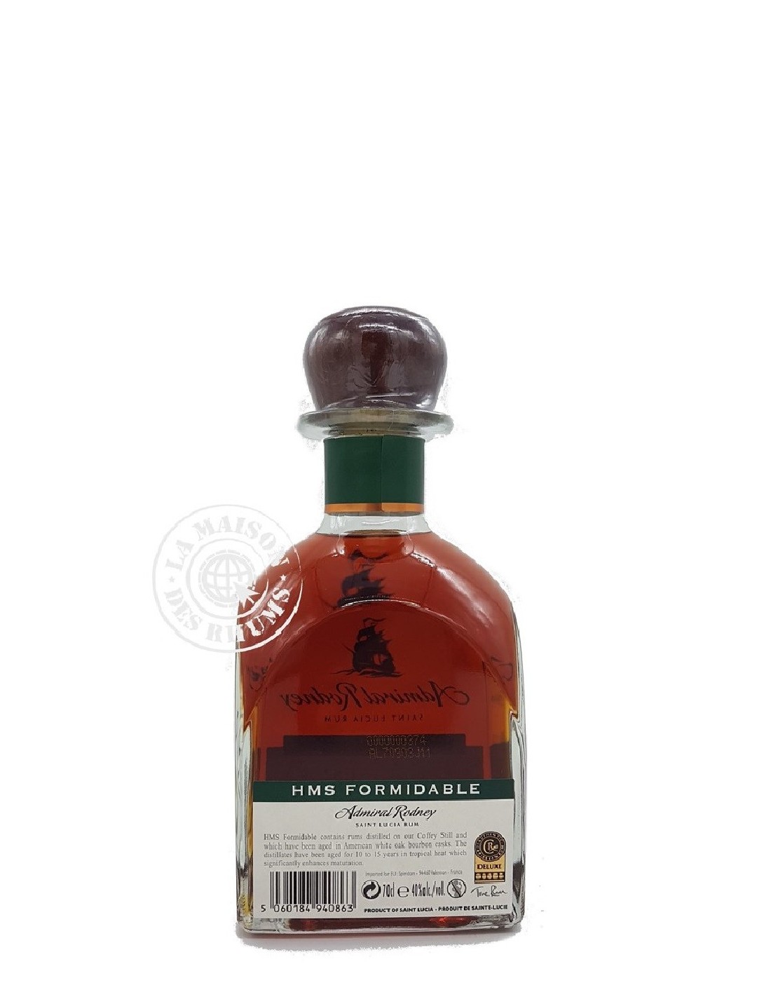 Ce Rhum Vieux Admiral Rodney HMS Formidable 40% est un assemblage de Rhums de mélasse âgés de 10 à 15 ans qui proviennent des plateaux inférieurs de l’alambic à colonne en cuivre à 45 plateaux de la distillerie Saint Lucia Distillers, située sur l'île de Sainte Lucie. Ces distillats possèdent un équilibre aromatique qui permet une lente maturation, pour un Rhum alliant structure, intensité et complexité.