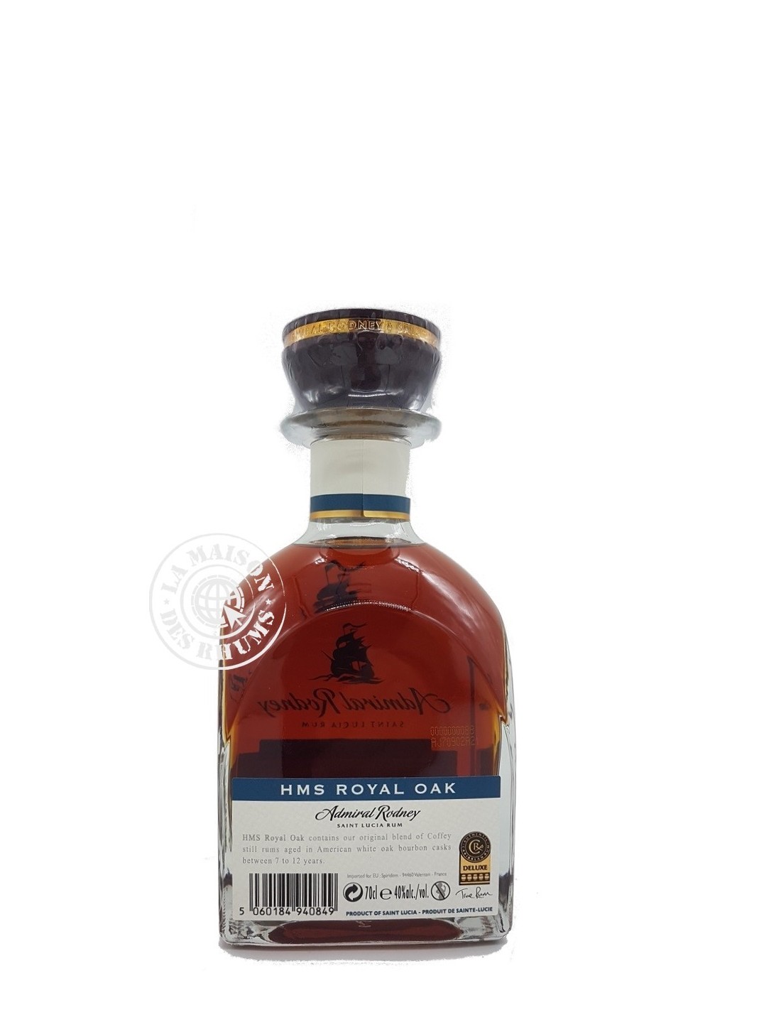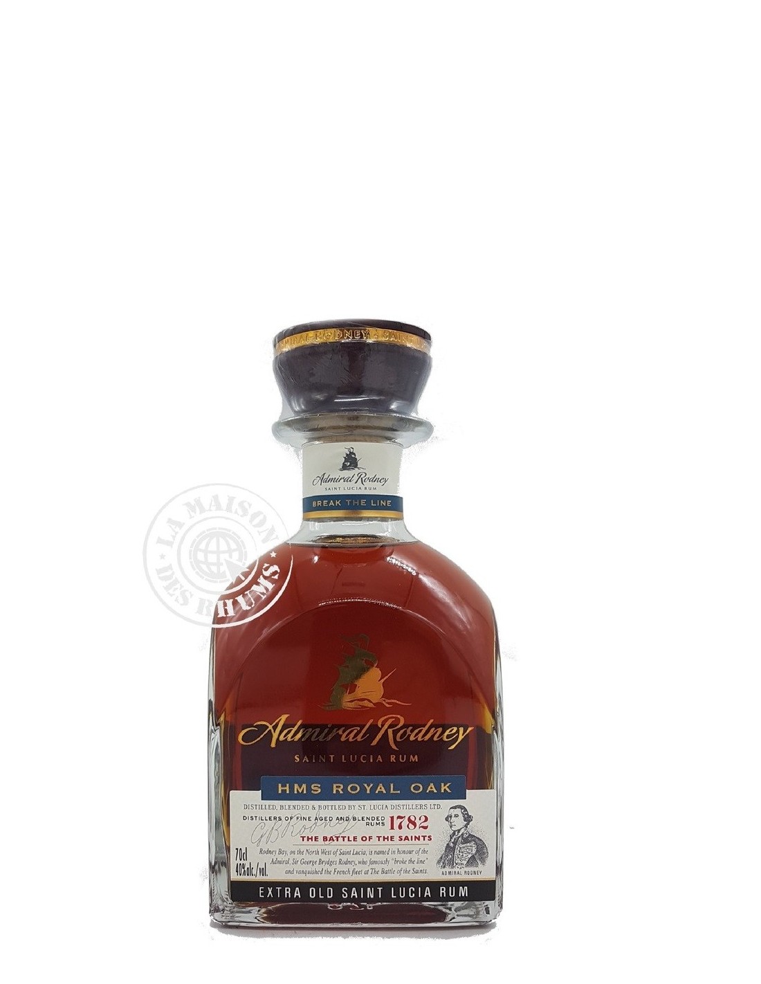 Ce Rhum Vieux Admiral Rodney HMS Royal Oak est un assemblage de Rhums de Tradition Britannique produit à partir de mélasse. Âgés de 7 à 12 ans, ils proviennent des plateaux inférieurs de l’alambic à colonne à 45 plateaux de la distillerie Saint Lucia Distillers, située sur l'île de Sainte Lucie. Ces distillats possèdent un équilibre aromatique qui permet un lent vieillissement en ex-fûts de Bourbon, pour un Rhum alliant structure, intensité et complexité.