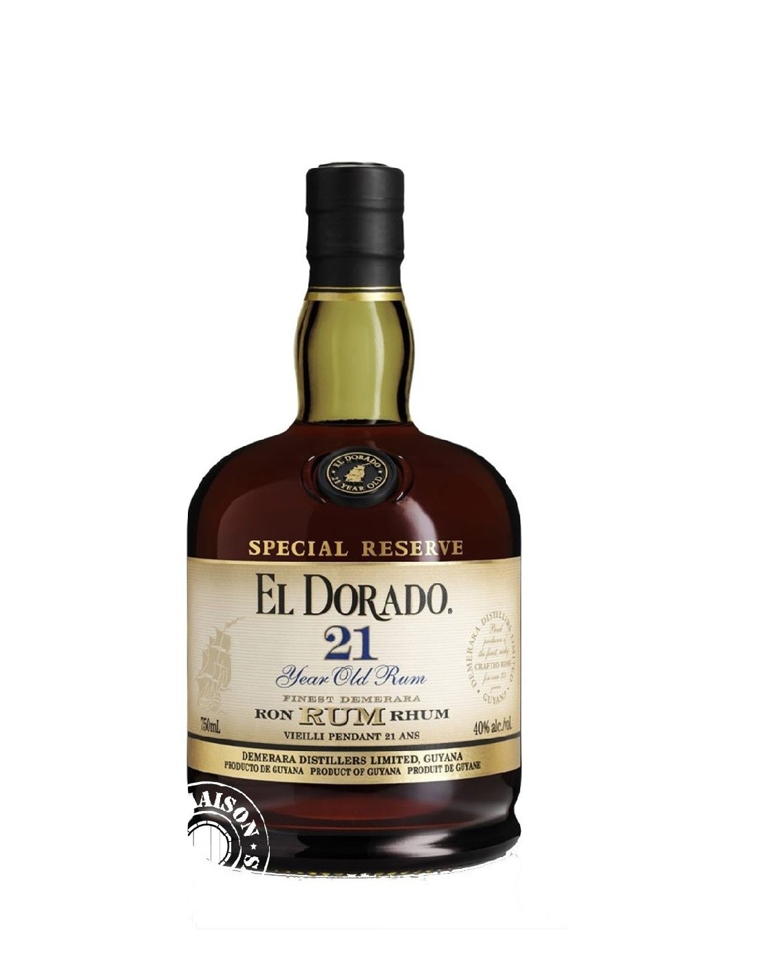 Le Rhum Vieux El Dorado 21 ans 43% est un Rhum produit dans la mythique Distillerie DDL (Demerara Distillers Limited) au Guyana, ex-Guyane Anglaise. La marque El Dorado fut la première, au début des années 1990 à apposer sur ses étiquettes des mentions d'âge indiquant le composant le plus jeune.