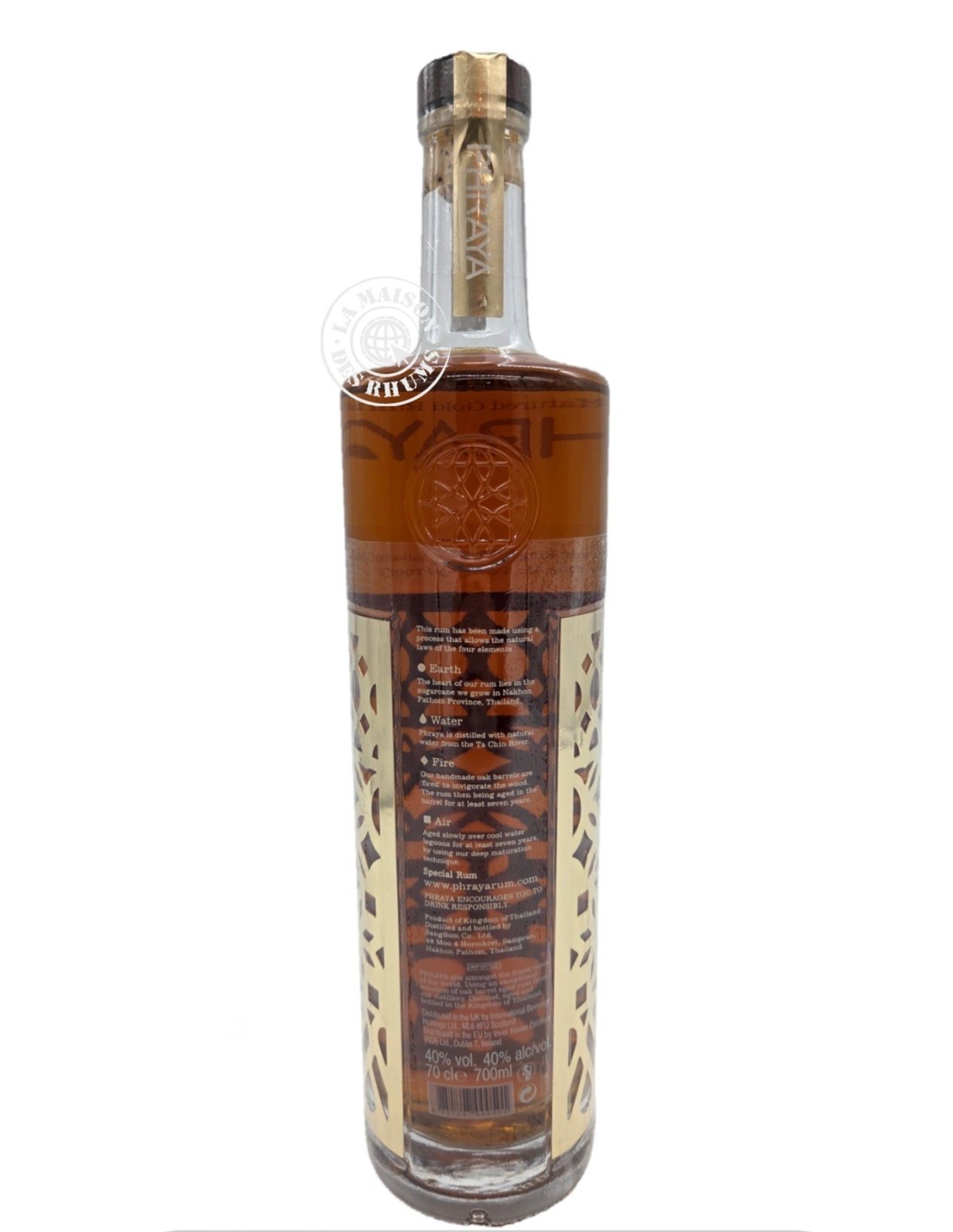 Rhum Phraya Hors d'âge - Gold 40%, élaboré à partir de mélasse, est issu d'un assemblage de Rhums vieillis entre 7 et 12 ans en fût de chêne américain sous le climat tropical de la Thaïlande Aucun sucre ni colorant ne sont ajoutés, assurant une expression des plus authentiques.