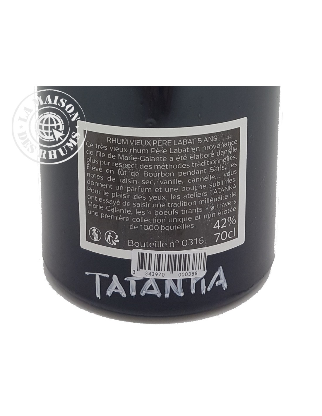 Le Rhum Tatanka Père Labat Vieux Les Bœufs Tirant 42% est un Rhum Vieux Agricole en provenance la distillerie Poisson, où sont produits les Rhums Père Labat. Après fermentation du vesou, ce dernier est distillé en colonne puis le Rhum obtenu est vieilli pendant 5 ans en ex-fûts de Bourbon. Il en résulte un profil aromatique soyeux, aux notes de raisin sec, de cannelle et de vanille.