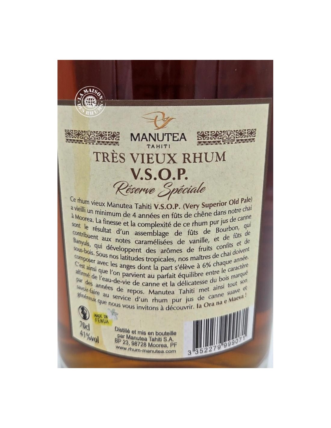 Produit par la distillerie Manutea basée à Moorea, le Rhum Manutea Vieux VSOP 41% est exclusivement produit à partir de la variété de canne à sucre O'Tahiti. Après une distillation discontinue en alambic hybride, le Rhum est mis en vieillissement tropical en ex-fûts de Bourbon et ex-fûts de Banyuls pendant un minimum de 4 ans.