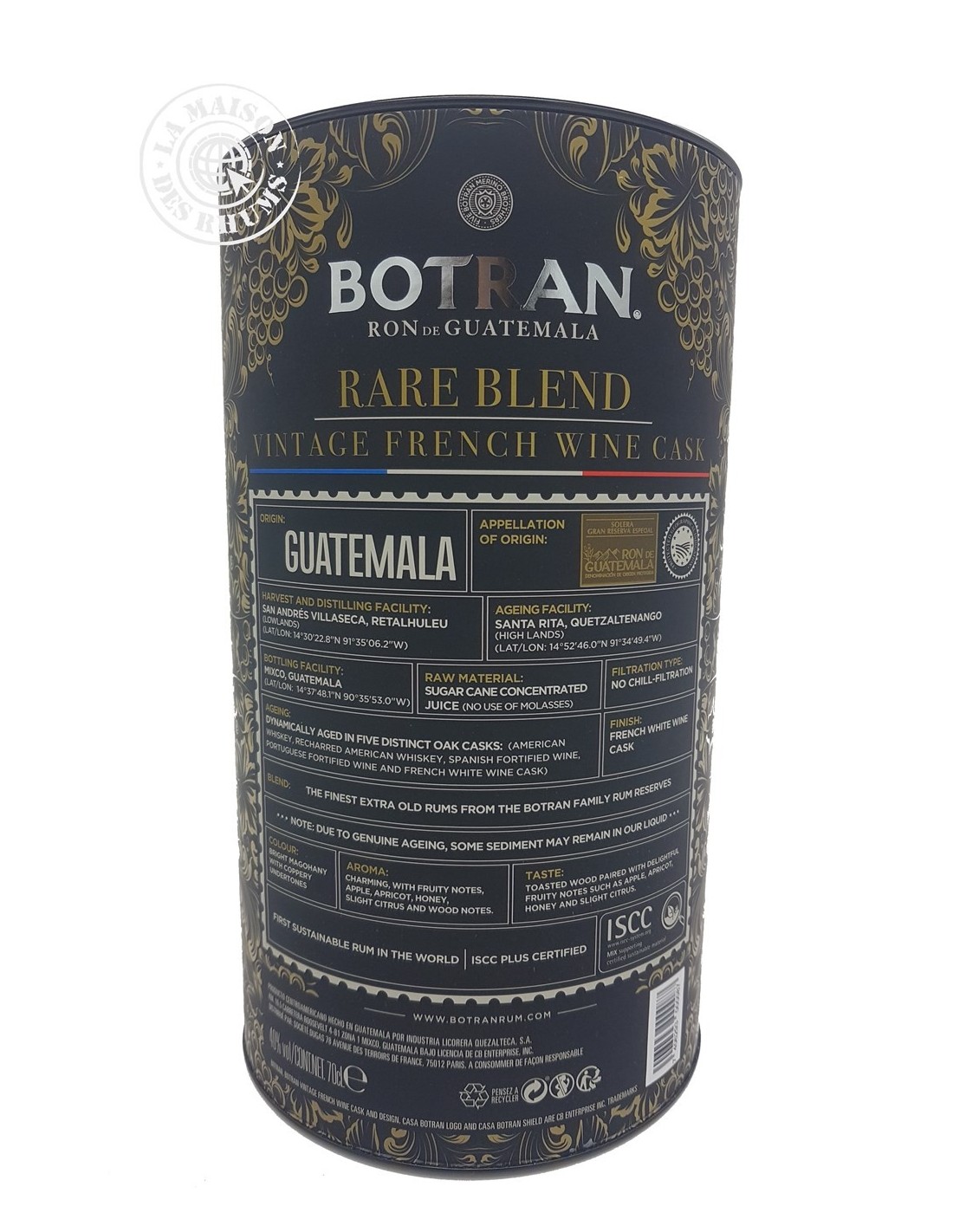 Le Rhum Botran Vieux Rare Blend Vintage French Wine Cask 40% est un Rhum Vieux traditionnel de miel de canne vierge produit au Guatemala. Après une première maturation en ex-fût de Bourbon, ce Rhum a bénéficié d'une finition audacieuse dans d'anciens fûts ayant précédemment servi à l'élevage du plus connu des Vins Effervescents français !