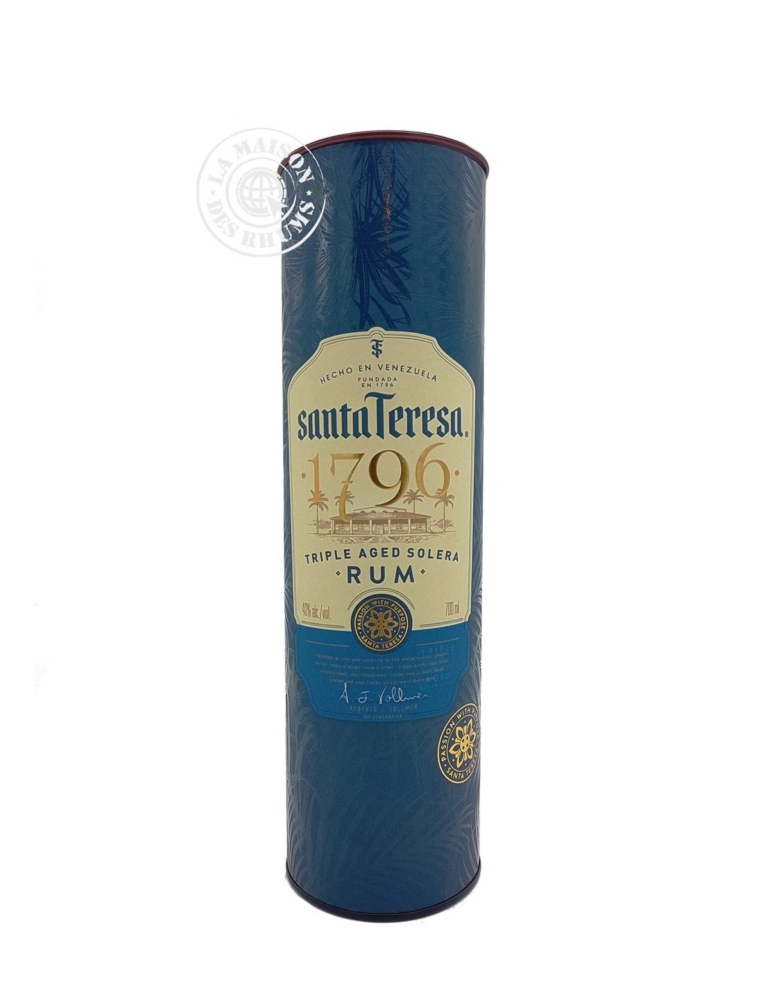 Le Rhum Santa Teresa Vieux Solera 1796 40% est produit au Venezuela par la famille Vollmer dans l'Hacienda Santa Teresa. Après distillation de la mélasse fermentée dans un alambic à colonne, le Rhum est élevé en ex-fûts de Bourbon suivant la traditionnelle méthode solera. À la mise en bouteille, les Rhums vont jusqu'à 35 ans d'âge et affichent 40%vol après réduction.