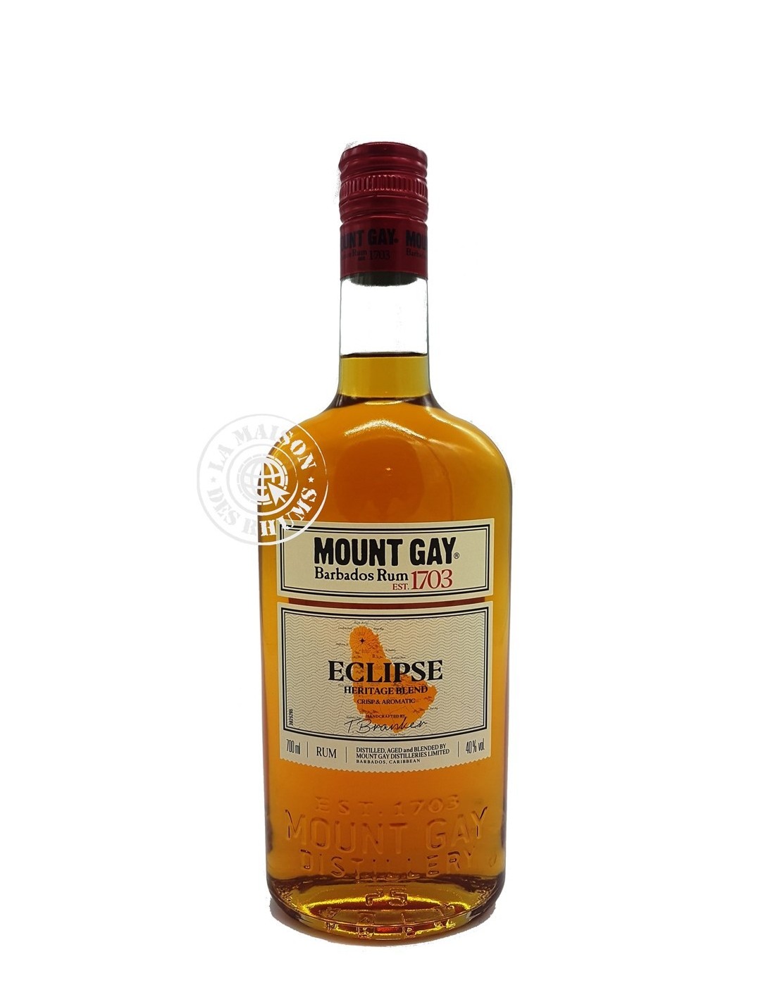 Le Rhum Mount Gay Ambré Eclipse 40% est un Rhum traditionnel de mélasse produit à la Barbade par la vénérable distillerie Mount Gay. Après fermentation la mélasse est distillée pour partie en alambic à repasse en cuivre et pour partie en colonne de distillation. Les Rhums sont ensuite vieillis en ex-fût de Bourbon pendant 2 ans sous le climat tropical de l'île.